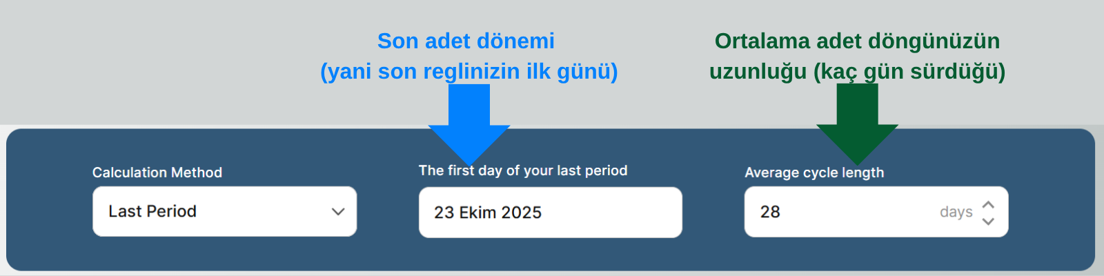 Tahmini doğum zamanını hesaplayabilmek için aşağıdaki kutucuklara son adet tarihi ve menstrüel döngünüzü (kaç günde bir regl oluyorsunuz) giriniz :